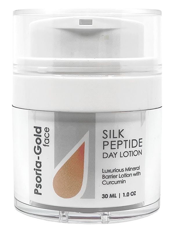 Silk Peptide Day Lotion 1.0 oz: Psoria-Gold Vegan Silk Barrier Lotion is a naturally derived light, yet luxurious and blendable whipped lotion with vegan silk polypeptides, probiotics, and biosimilar plant-based oils for barrier protection. In addition, this lotion contains UV mineral blockers, zinc oxide and rose kaolin clay. Finally, contains curcumin extract, a potent anti-oxidant and anti-inflammatory. Provides translucent coverage. Protects against dryness, UV exposure, & collagen loss. Instantly absorbs into the skin with visually smoothing and brightening benefits. Moisturizing with non-oily, matte finish. Compatible with all skin types and complexions. 1.0 oz Airless Jar.